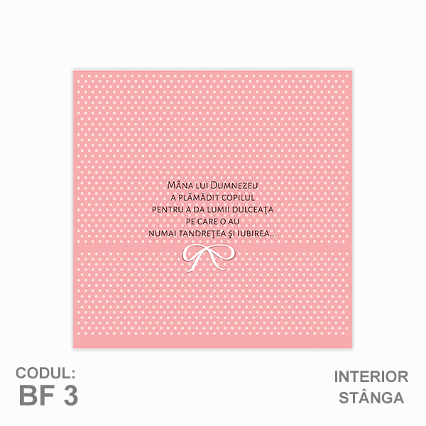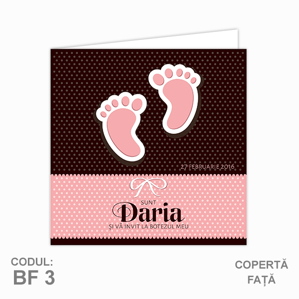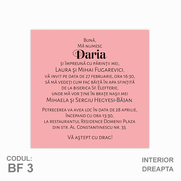 INVITATIE BOTEZ FOLD (PLIATA), personalizata, confectionata din carton standard, velin de 300g, print digital fata/verso. Dimensiuni: 16x16 cm - inchisa, 32x16 cm deschisa. Printarea textului este inclusa în pret!