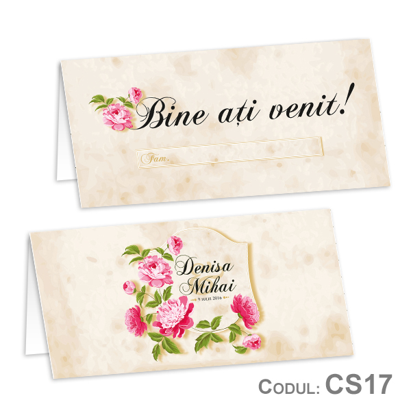 PLACE CARD personalizat integral, confectionat din carton velin, print digital, format desfasurat 15x11,5 cm, format inchis (pliat) 7,5x11,5 cm.