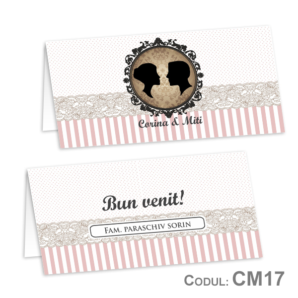 PLACE CARD personalizat integral, confectionat din carton velin, print digital, format desfasurat 15x11,5 cm, format inchis (pliat) 7,5x11,5 cm.