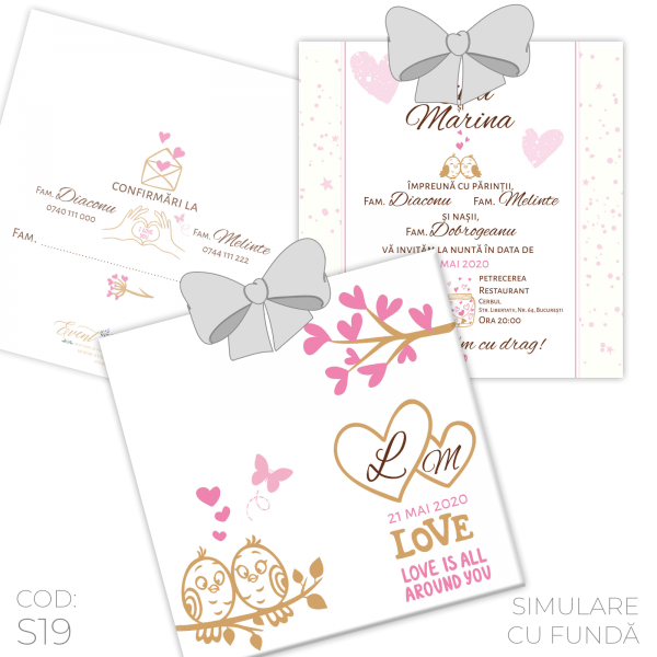 Opțiuni Personalizare Model Invitație: culori fundal grafică, text, etichetă si chenar plic, fundal și chenar planșă text de pe card, fonturi text