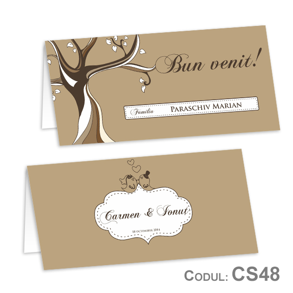 PLACE CARD personalizat integral, confectionat din carton velin, print digital, format desfasurat 15x11,5 cm, format inchis (pliat) 7,5x11,5 cm.
