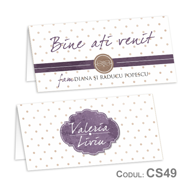 PLACE CARD personalizat integral, confectionat din carton velin, print digital, format desfasurat 15x11,5 cm, format inchis (pliat) 7,5x11,5 cm.
