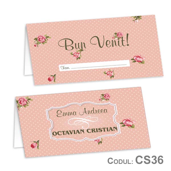 PLACE CARD personalizat integral, confectionat din carton velin, print digital, format desfasurat 15x11,5 cm, format inchis (pliat) 7,5x11,5 cm.