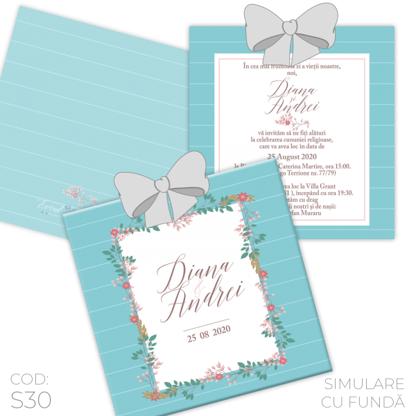 Opțiuni Disponibile: poți adăuga accesorii de tip fundă în partea superioară a cardului, unde se va efectua suplimentar o perforare pentru atașarea fundei